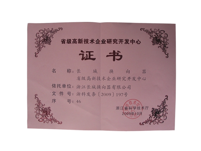 2009年省级高新技术企业研发中心证书