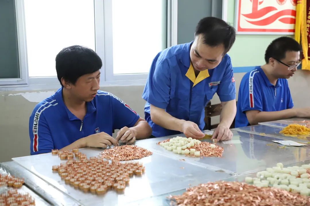 走进劳动工作间,残疾人朋友们正专心且熟练地将一个个铜片插入塑料芯中。而这些完成的半成品,后续会用到换向器的生产中。陈凤仙等一行人纷纷加入其中,与残疾人朋友们交流互动。遇到做的不熟练的还给他们做了示范,帮助他们提高工作效率。