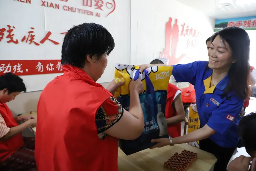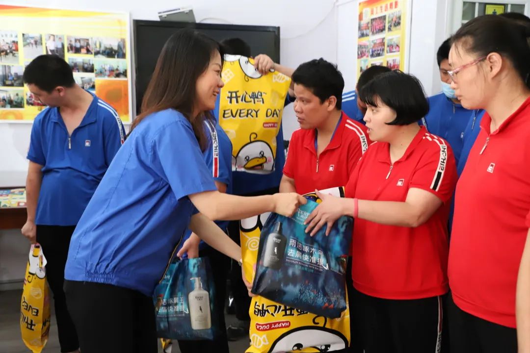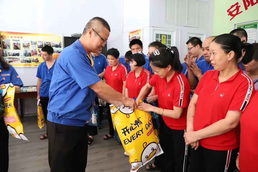 随后四人代表公司向残疾人朋友赠送了夏季用品、零食大礼包等物品。并亲切叮嘱大家高温天气下要多关注自己的身体,快乐工作;鼓励大家要树立自信,勇于融入社会生活;长城也将持续关注、关心大家的生产和生活情况。